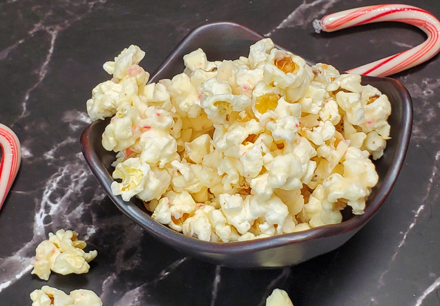 Popcorn, white chocolate, and candy canes combine to make a delightfully minty treat!