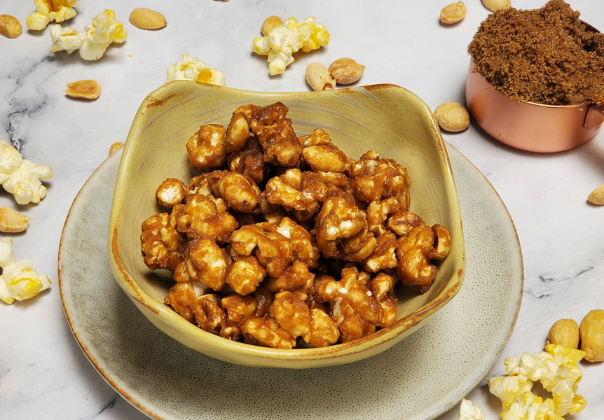 Add the popcorn and peanuts to the bowl. Don’t just pour the popcorn in. That will add unpopped kernels to the mix, and we don’t want that. Let the popcorn cool, then transfer it a handful at a time, making sure you don’t pick up any unpopped kernels.