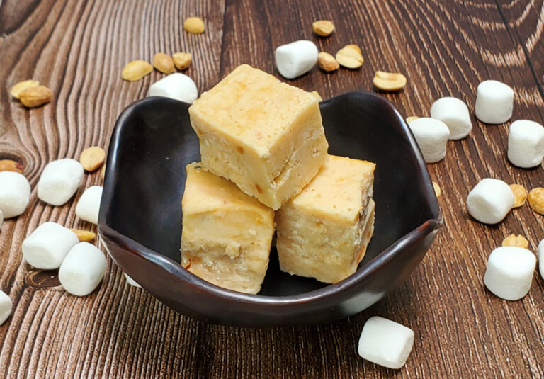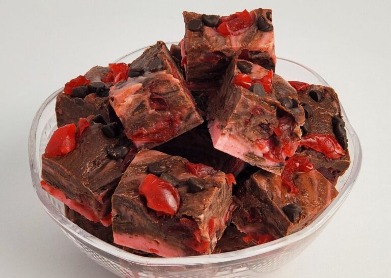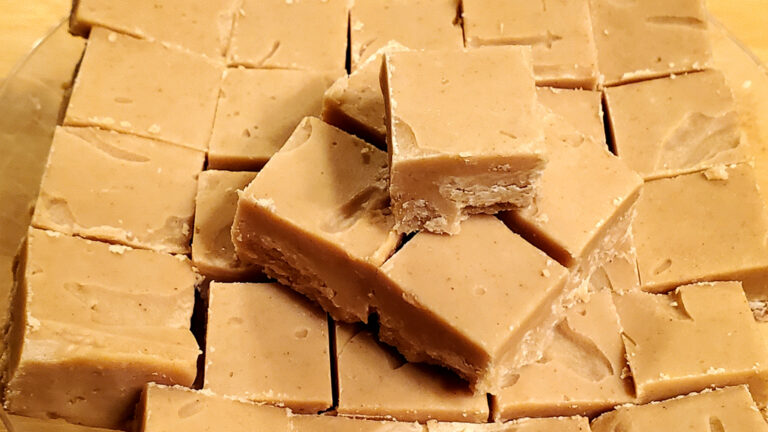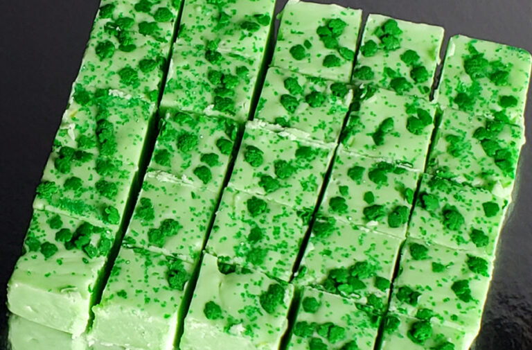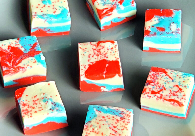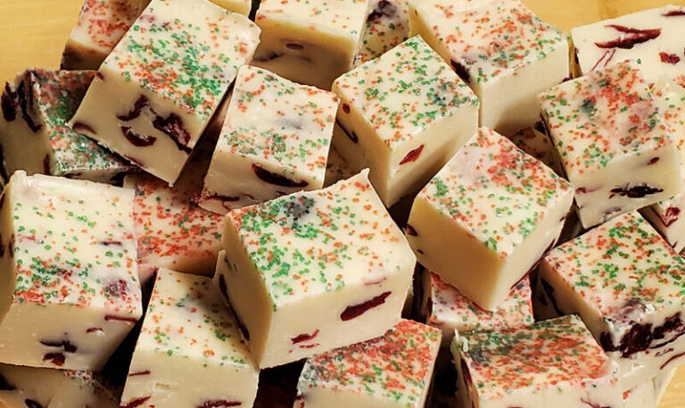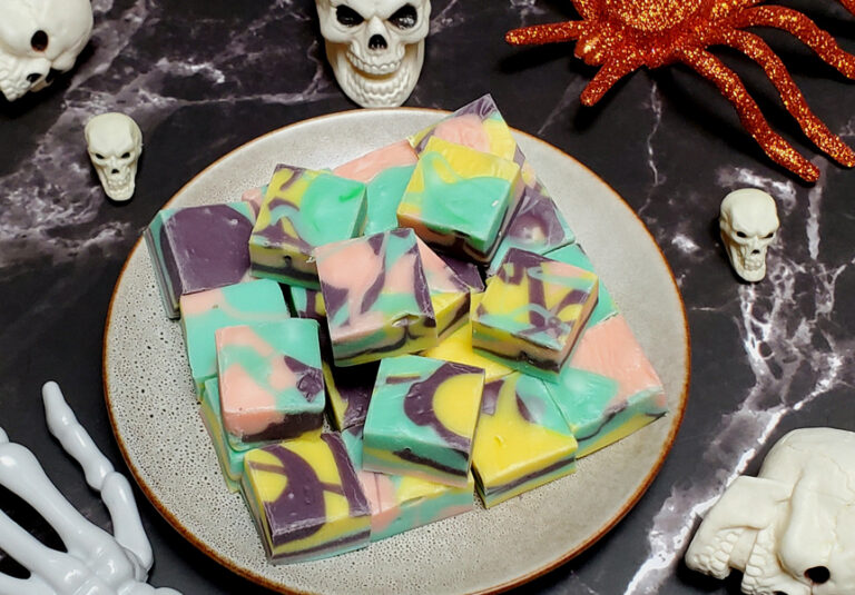 A white chocolate fudge with colors reminiscent of Sally’s patchwork dress in The Nightmare Before Christmas.