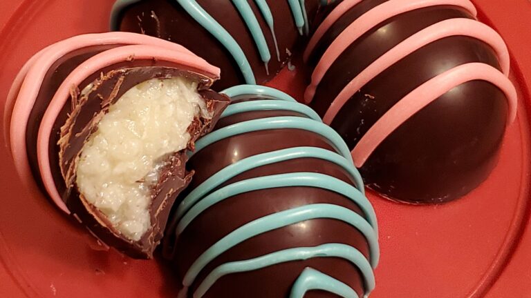 Get the recipe →Creamy marshmallow, crunchy almonds, and chewy coconut, enrobed in a milk/dark chocolate coating.