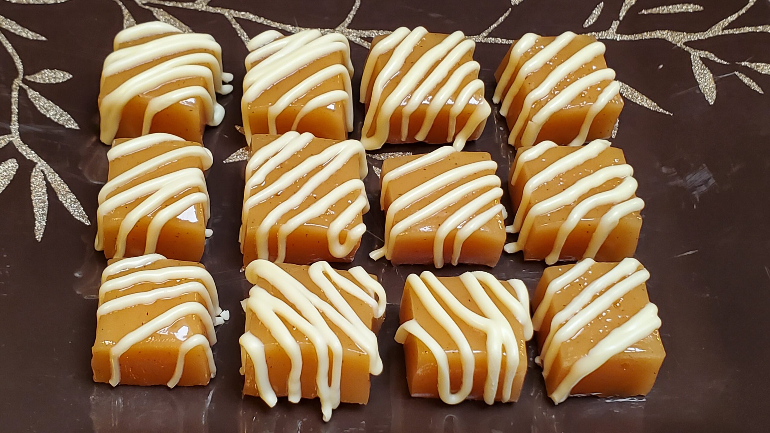 Temper the white chocolate, pour it into a piping bag, and pipe it onto the caramels.