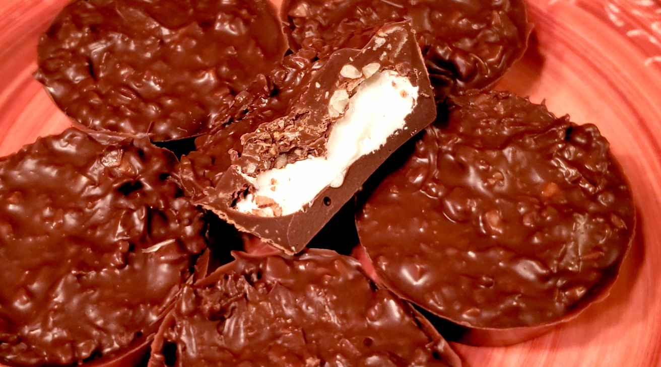 Creamy marshmallow, crunchy almonds, and chewy coconut, enrobed in a milk/dark chocolate coating.