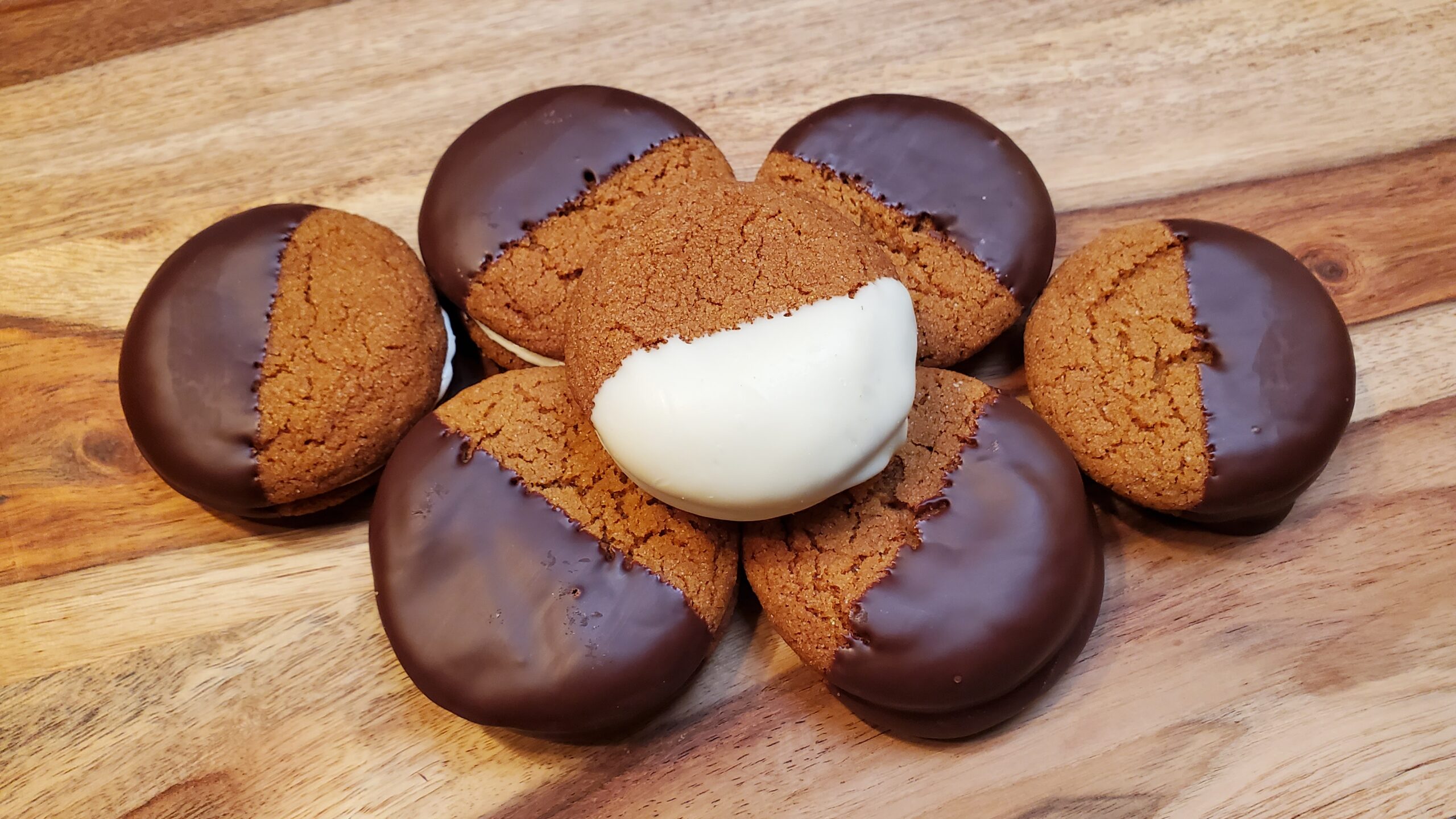 Gingerbread cookies are delightful. Stuff them with a marshmallow cream filling and dip them in chocolate and you’ve got a real winner!