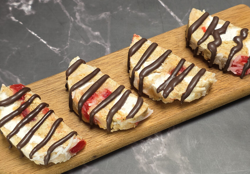 Spread half of the coconut onto the plastic wrap in a rectangular shape.