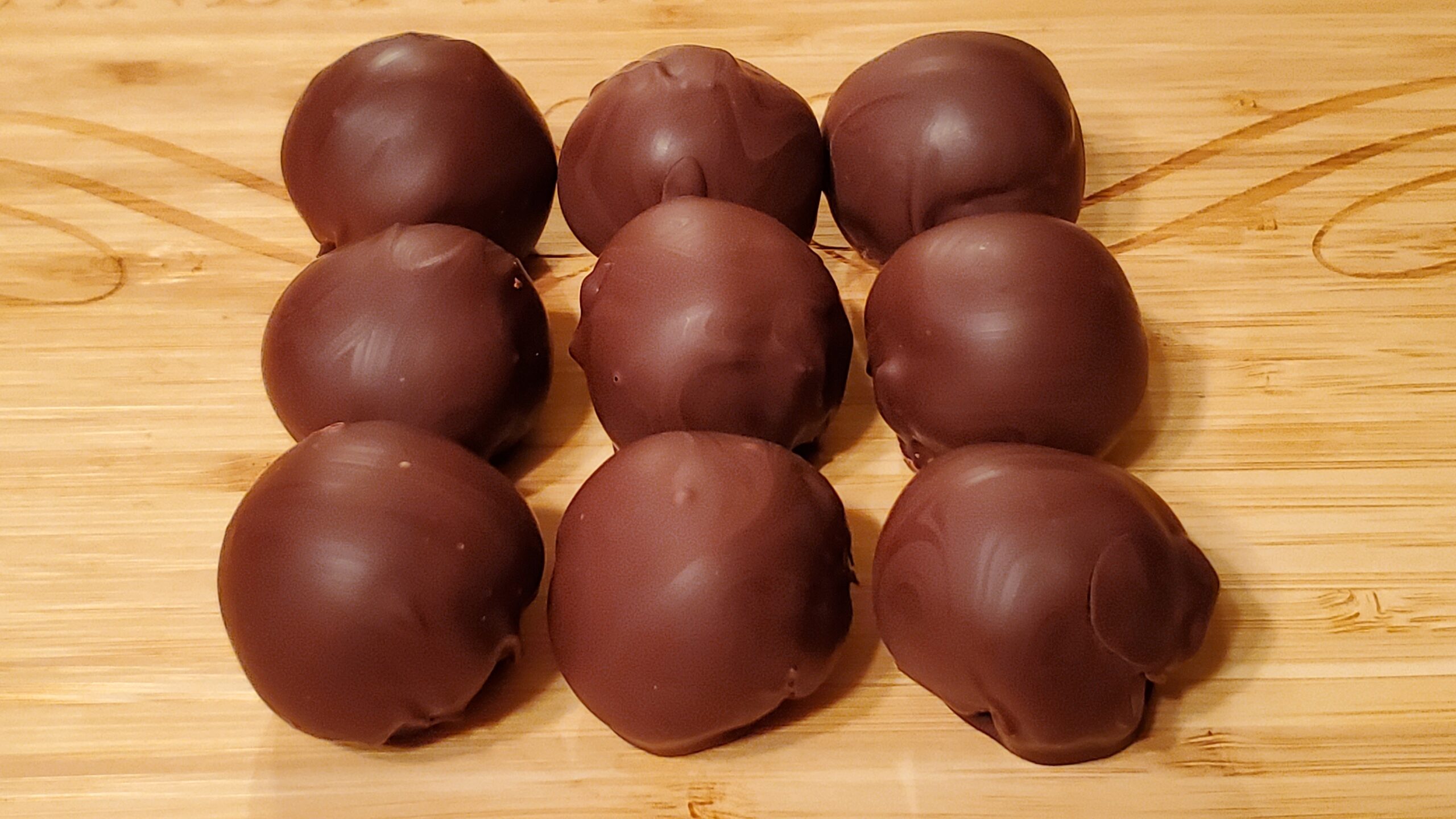 Dip a dough ball into the chocolate, drain the excess, and place it on the lined cutting board.