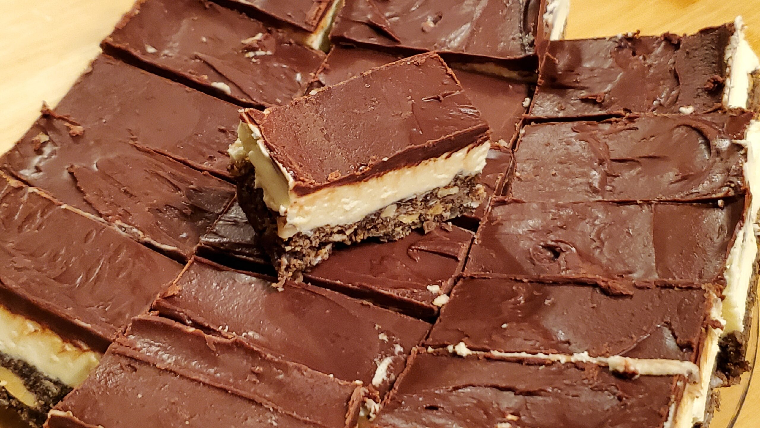 Refrigerate it for at least two hours, then cut it into whatever size pieces you’d like. If you find that the chocolate layer is cracking, you can use a serrated knife to cut through it more evenly.