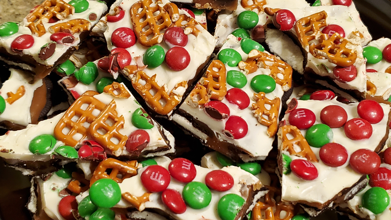 Sprinkle the chopped pretzels and M&Ms over the top and gently press them into the chocolate.