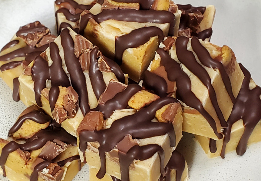 Spread the chopped peanut butter cups evenly over the fudge, then gently press them in using a spatula.