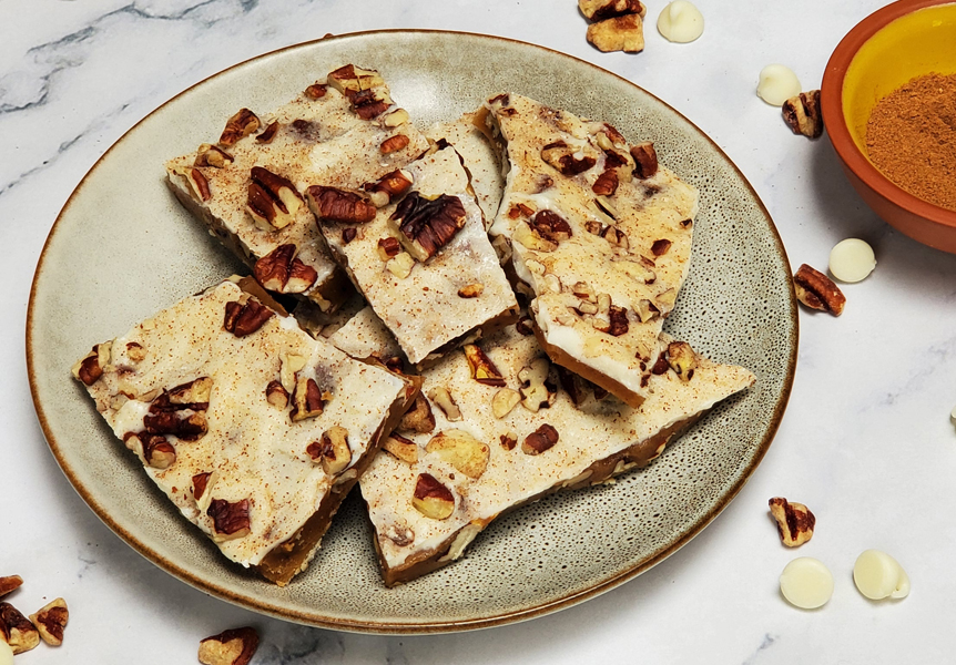 Spread the white chocolate on top of the toffee, then sprinkle the remaining pecans and sugar/pumpkin pie spice mixture over the top.