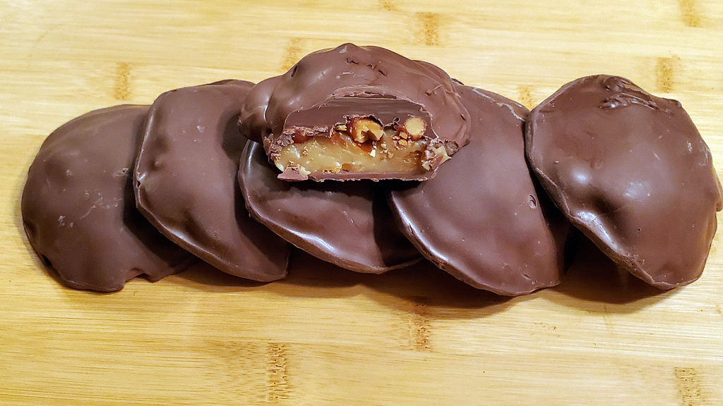 When they’ve cooled enough to handle, put some caramel on the lined cutting board. These are free form, so use as much as you’d like, and don’t worry about the shape.