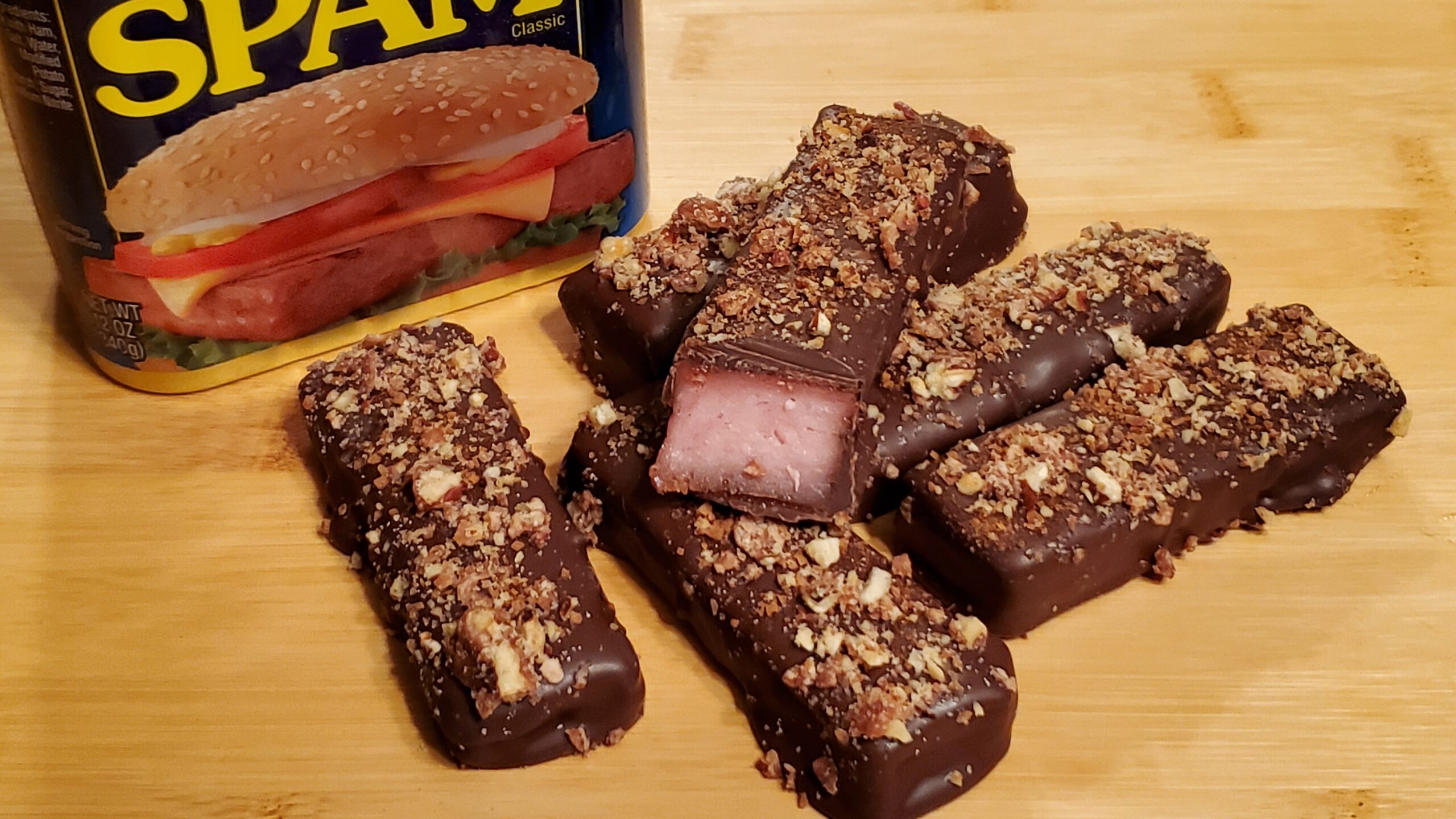 Definitely the strangest recipe I’ve made, even for April Fool’s Day. Candied bacon is one thing, but chocolate-covered candied spam? Watch the video to get my take on it.
