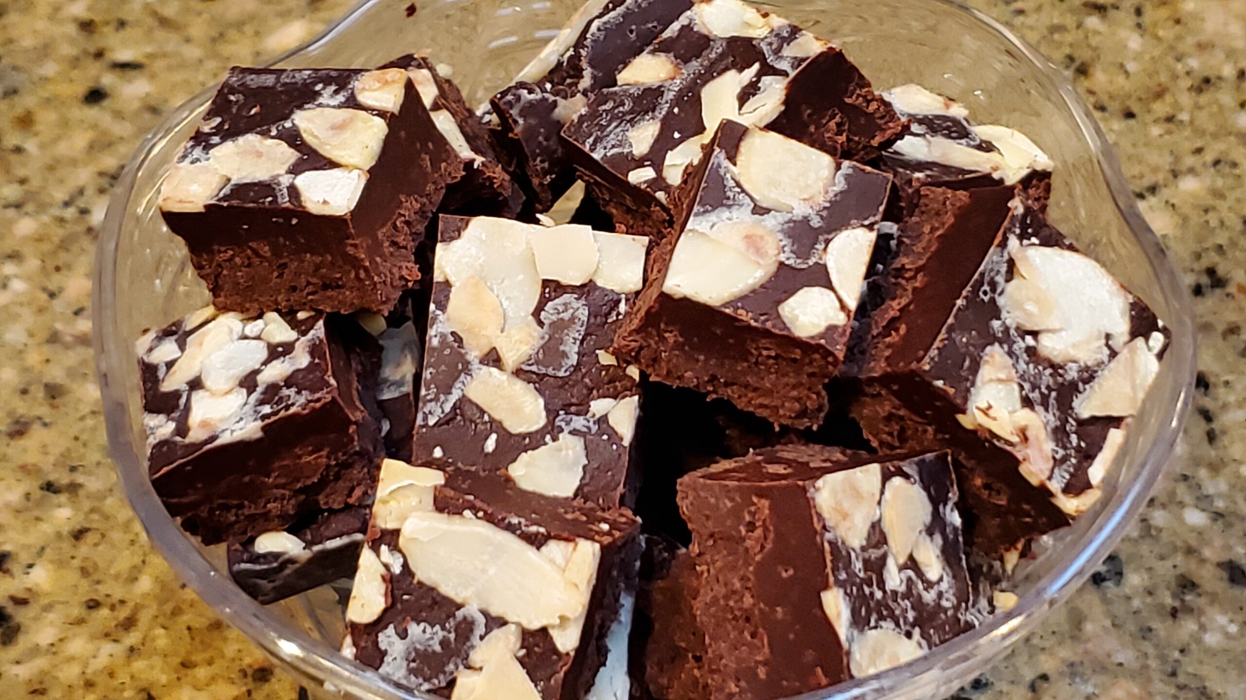 Pour the fudge into the prepared baking dish and top with sliced almonds.