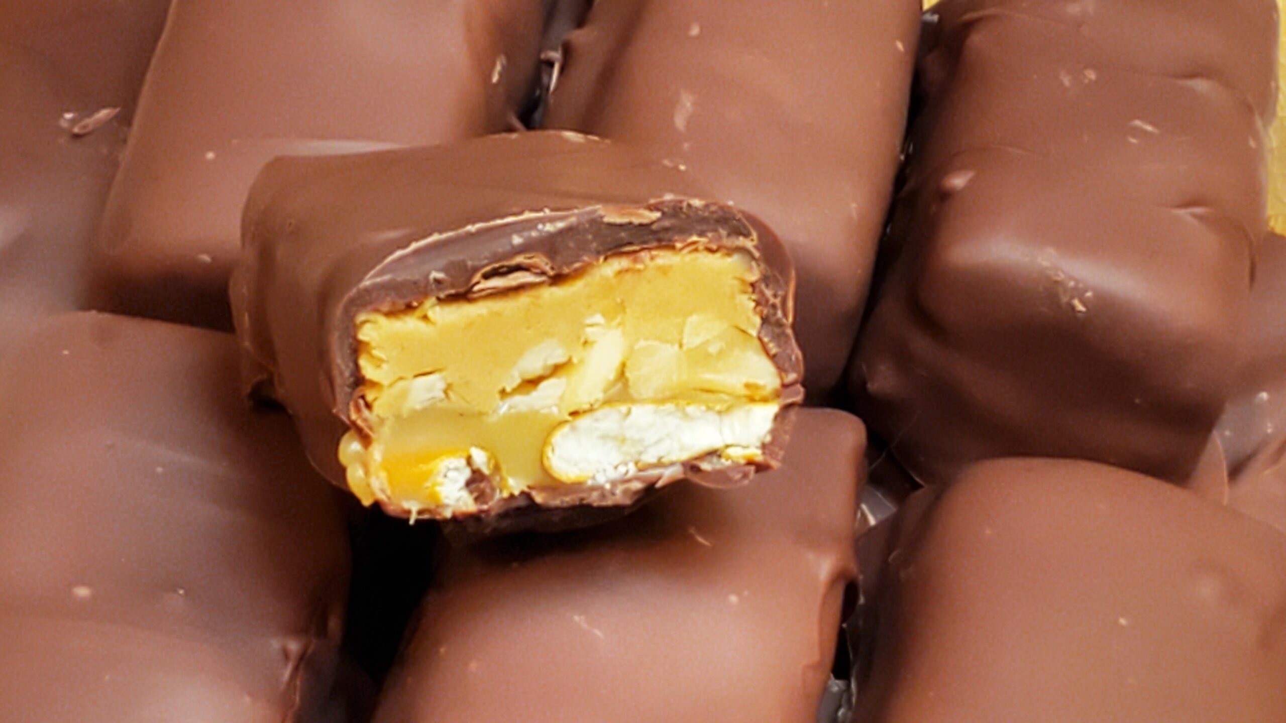 Remove the candy from the freezer and dip each bar into the melted chocolate, making sure it’s completely coated, and that the pretzel layer remains on bottom.